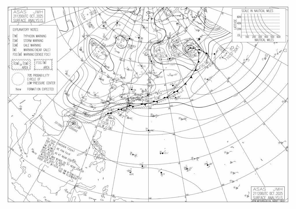 秋雨前線が大きくうねっていて、東経154度あたりで1012hPaの低気圧が発生しました。秋雨前線に沿ったように分布していた海上濃霧警報の領域は西側の方に集中していますね。