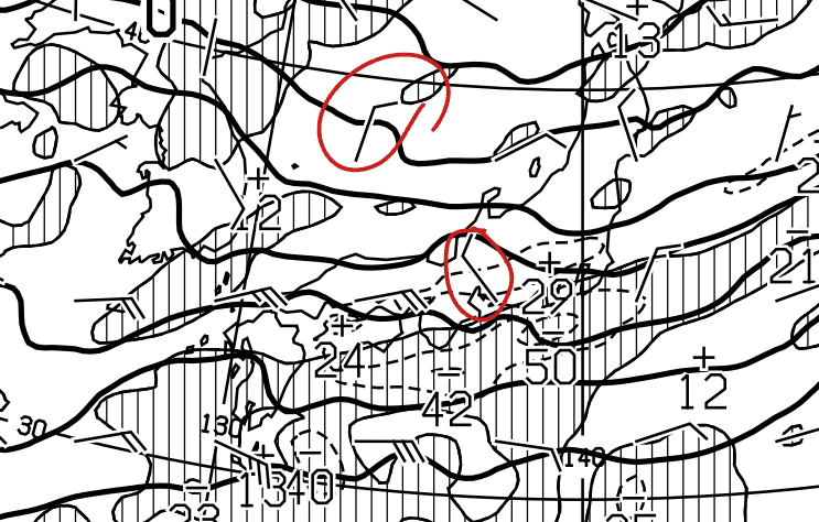 先程の二つの天気図のうち21日21時の方をアップしたものです。赤丸の部分が850hPaの北寄りの風、そして黒い太線が850hPaの等温線です。