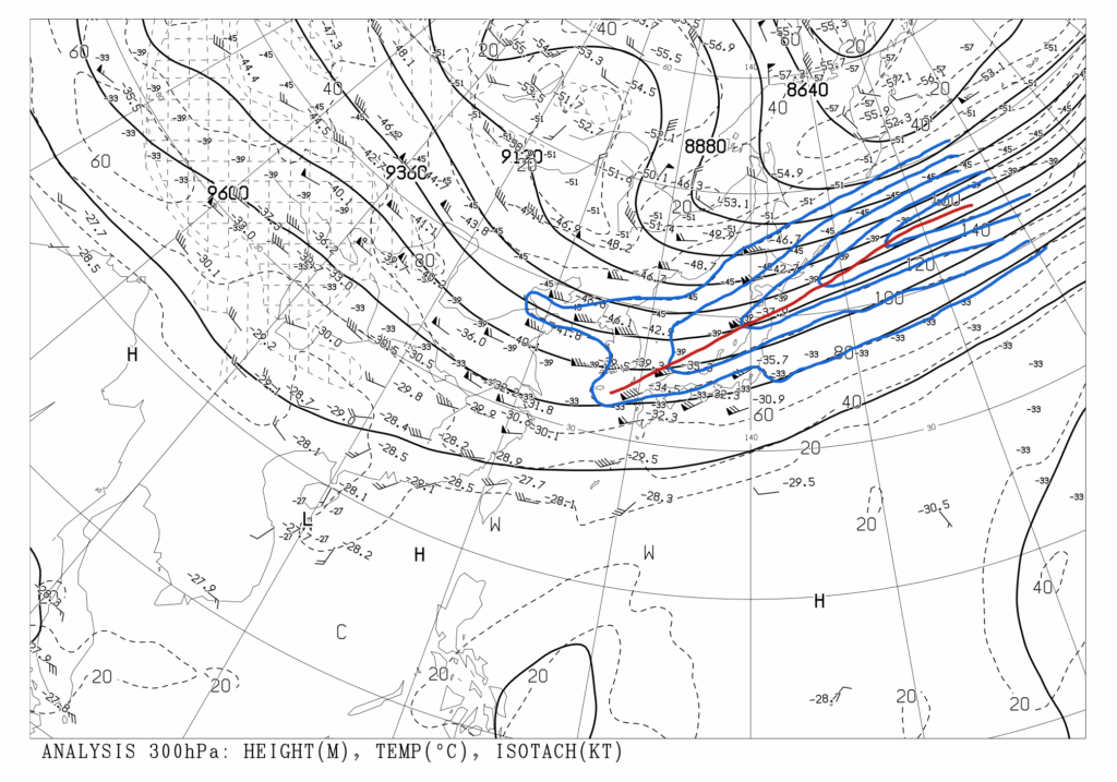 東側の方は省略しているのですが、赤線の部分がジェット気流だと考えられます。気象衛星画像で見たトランスバースラインと概ね一致しているように思えます!