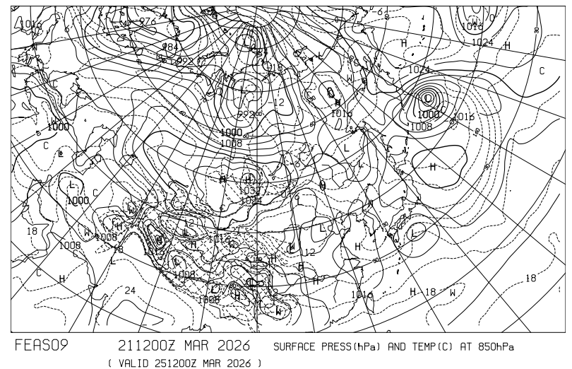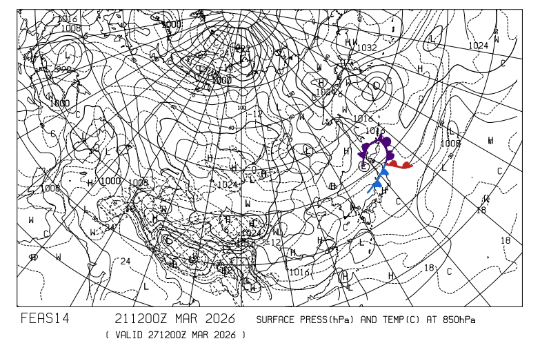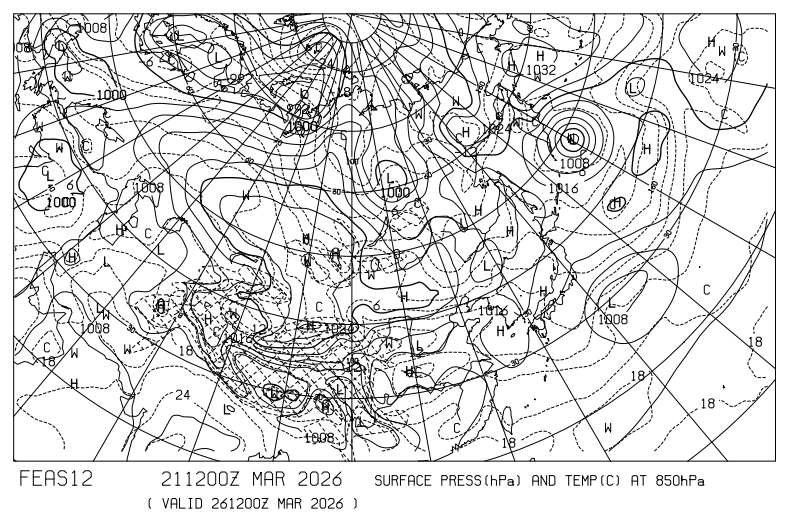アジア地上気圧、850hPa気温 27日21時の予想図